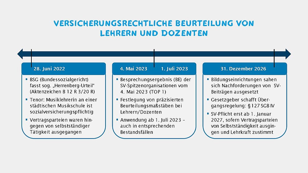 Nach der Übergangsregelung in § 127 SGB IV soll eine Feststellung des Sozialversicherungsstatus von Lehrkräften als abhängig beschäftigt durch die Sozialversicherungsträger bis zum 31. Dezember 2026 ohne Wirkung bleiben; d. h. die Versicherungspflicht soll erst ab dem 1. Januar 2027 beginnen. Dies gilt immer dann, wenn