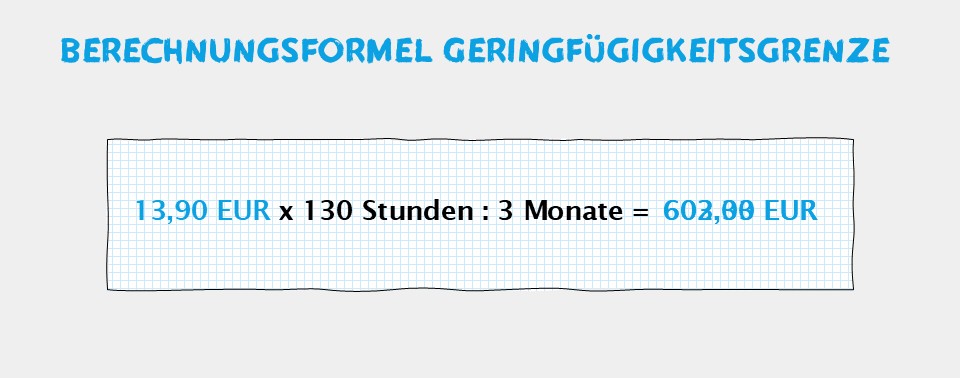 Berechnung: Der gesetzliche Mindest-Stundenlohn wird mit 130 Stunden (13 Wochen pro Quartal multipliziert mit 10 Stunden) vervielfacht, durch 3 Monate geteilt und der sich daraus ergebende Betrag wird auf volle Euro aufgerundet.