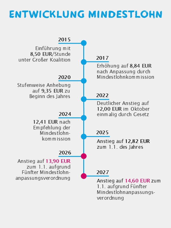 Die Mindestlohnkommission hat alle zwei Jahre über eine Anpassung der Höhe des gesetzlichen Mindestlohns zu beschließen (§ 9 Abs. 1 MiLoG) – heißt also bis zum 30. Juni 2025 für die Jahre 2026 und 2027. Am 27. Juni 2025 erfolgte der fünfte Beschluss mit einer Erhöhung in zwei Stufen (jeweils brutto je Zeitstunde):
